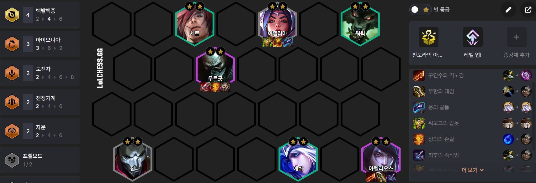 7 레벨에 타릭을 넣어 주시고 (아펠리우스나 우르곳이 나왔다면 타릭을 빼줍니다.)